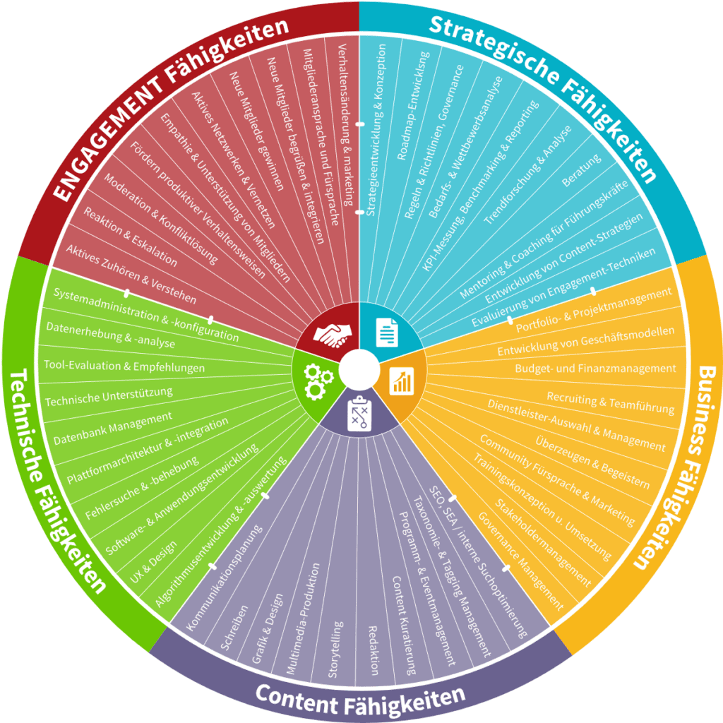 Der Community Roundtable hat eine Übersicht der Fähigkeiten eines Community Managers erstellt. Diese sind aufgeteilt in fünf Kategorien: